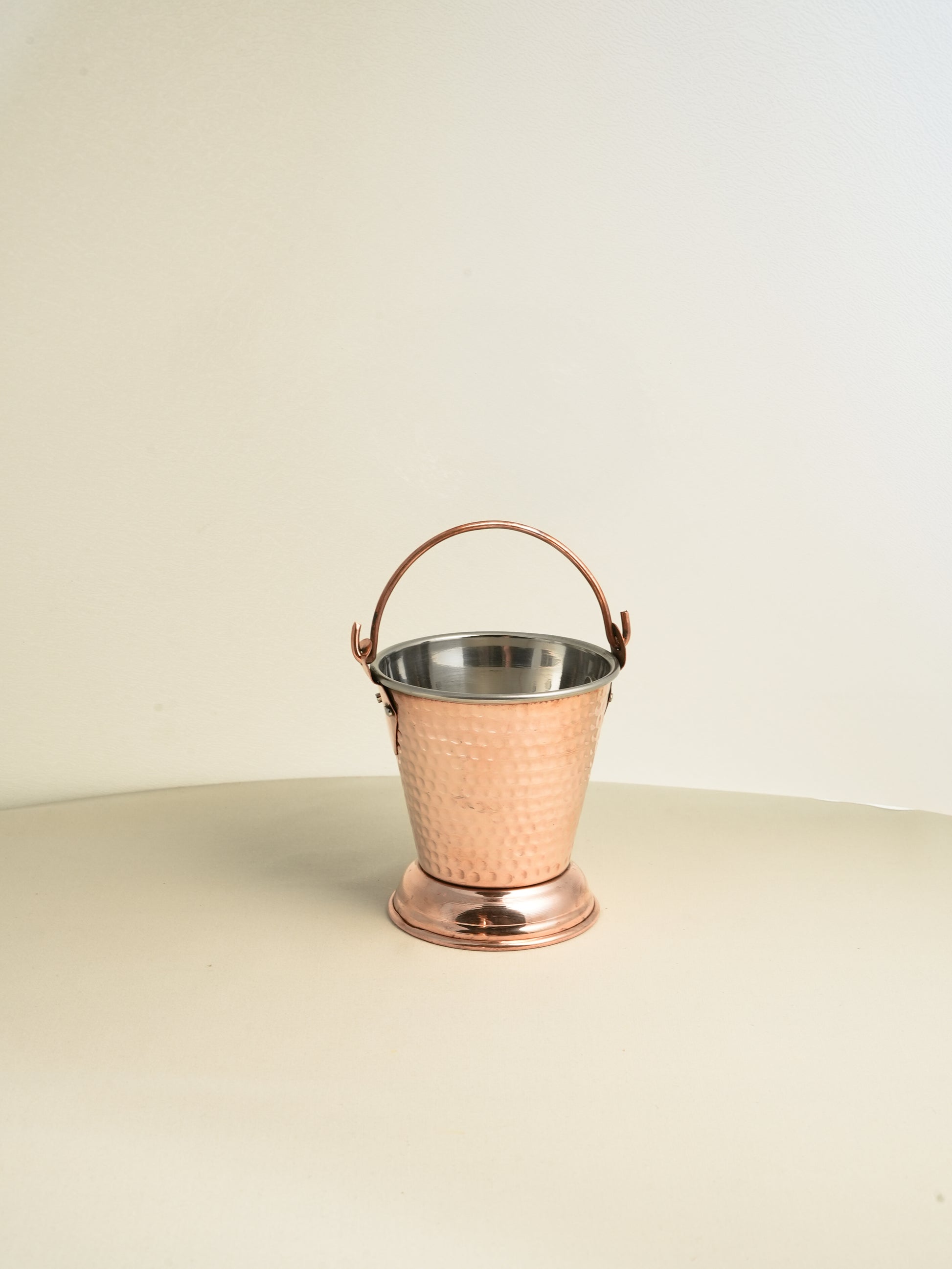 Miniature copper bucket for serving gravies or curries. Adds charm to dining tables and festive meals.